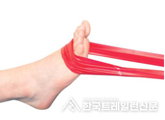 발바닥에 밴드를 걸어 빠지지 않게 하시고 발목만 이용하여 발목을 펴는 운동을 10회 반복합니다. 밴드가 없다면 수건을 이용하셔도 됩니다.