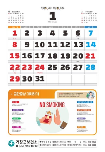 거창군은 오는 24일부터 군민 건강증진을 위한 2023년 건강달력 2천부를 제작해 보건기관 방문 민원인을 대상으로 배부한다.