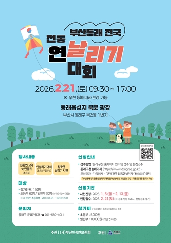 부산 동래구(구청장 장준용)는 오는 2월 21일 오전 9시 30분부터 오후 5시까지 동래읍성지 북문 광장에서 ‘부산동래 전국 전통연날리기 대회’를 연다고 밝혔다. 이번 행사는 (사)부산민속연보존회가 주관하며, 세대가 함께 즐기고 전통문화를 계승하는 가족 참여형 축제로 마련됐다.