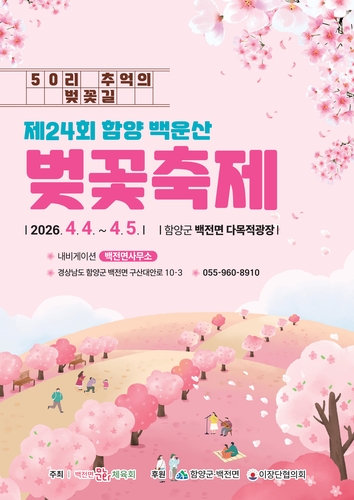 함양군은 오는 4월 4일부터 5일까지 이틀간 백전면 다목적광장 일원에서 ‘제24회 함양 백운산 벚꽃축제’를 개최한다고 밝혔다.