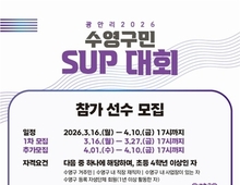 수영구, ‘2026 수영구민 SUP 대회’ 참가자 모집부산광역시 수영구(구청장 강성태)는 오는 3월 16일(월)부터 4월 10일(금)까지 광안리 해변 SUP ZONE 일원에서 열리는 ‘2026 수영구민 SUP 대회’ 참가자를 모집한다고 밝혔다. 지역 주민들의 해양스포츠 참여 확대와 해양레저 문화 활성화를 위해 2022년부터 매년 개최되고 있는 이 대회는 광안리를 대표하는 해양스포츠 행사로 자리매김하고 있다. 이번 대회는 초등학교 4학년 이상 수영구민을 대상으로 진행되며, 연령대별로 초등학생, 30대 이하, 40대, 50대 이상으로 구분해 동별 14명씩 선발해 총 140명의 참가자가 참여할 예정이다. 참가 신청은 광안리 SUP 홈페이지(https://gwangallisuprise.kr)를 통해 가능하다. 모집은 1차(3월 16일∼3월 27일)와 추가 모집(4월 1일∼4월 10일)으로 나누어 진행되며, 참가비는 5만 원이다. 특히 신규 참가자의 기회를 확대하기 위해 2022∼2025년 대회에 2회 이상 참가한 이력이 있는 경우 신청이 제한된다. 수영구 관계자는 “수영구민 SUP 대회를 통해 구민들이 바다와 더욱 가까워지고 해양스포츠를 일상 속에서 즐길 수 있기를
