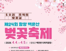 함양군, 제24회 백운산 벚꽃축제 4월 4~5일 개최 함양군은 오는 4월 4일부터 5일까지 이틀간 백전면 다목적광장 일원에서 ‘제24회 함양 백운산 벚꽃축제’를 개최한다고 밝혔다. 백전면 문화체육회(회장 황원하)가 주최·주관하는 이번 축제는 50리 벚꽃길을 배경으로 다양한 체험행사와 먹거리, 그리고 ‘백운산 벚꽃 전국트롯가요제’ 등 풍성한 프로그램을 마련해 상춘객들을 맞이한다. 백전면 50리 벚꽃길은 30여 년 전 함양 출신 고(故) 박병헌 재일거류민단장이 기증한 벚나무가 보전·관리돼 오늘날 함양의 대표 봄 명소로 자리 잡았다. 축제 첫날인 4일에는 성공기원제를 시작으로 개막식과 축하공연, 주민자치프로그램 공연, 면민 노래자랑 등이 진행된다. 둘째 날인 5일에는 마을 대항 민속놀이와 제3회 전국트롯가요제, 지역 가수 공연이 이어지며, 야간조명으로 물든 벚꽃길이 방문객들의 체류 시간을 늘릴 예정이다. 특히 올해로 3회째를 맞는 ‘백운산 벚꽃 전국트롯가요제’는 5일 예선과 6일 본선을 통해 12명의 본선 진출자가 가창력을 겨루며 축제의 열기를 더한다. 참가 신청은 오는 3월 31일까지 (사)한국연예예술인총연합회 함양지회에서 접수 가능하다. 이와 함께 지역 농특산